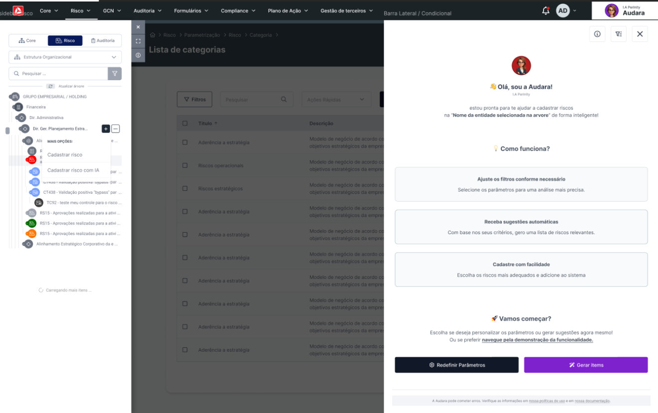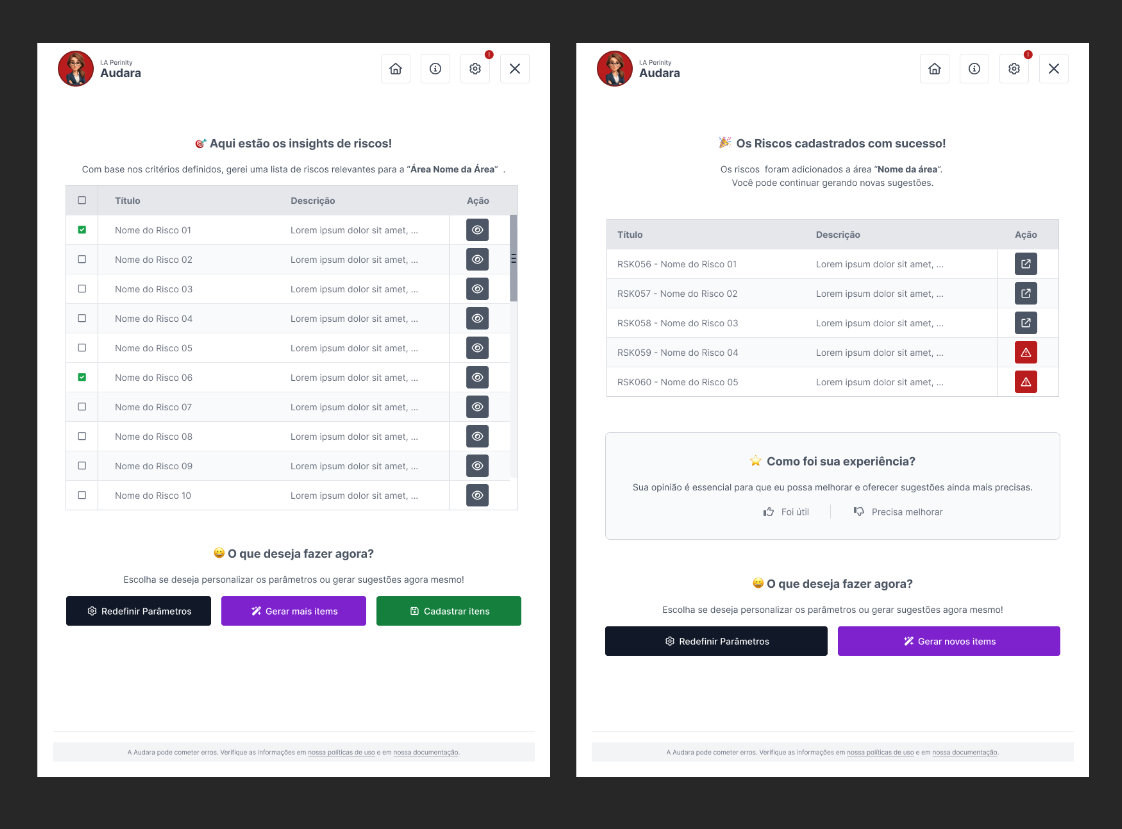 A Audara se tornou uma assistente inteligente capaz de auxiliar os usuários tanto em dúvidas sobre o sistema quanto em conceitos de GRC.Além disso, ela passou a automatizar etapas, como o preenchimento da base de riscos: de acordo com o setor da empresa, a IA sugeria riscos relevantes e pré-preenchia campos, cabendo ao usuário apenas revisar e confirmar.